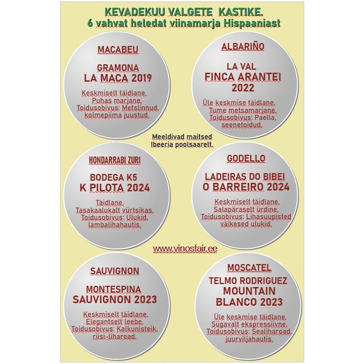 Valgete veinide kastis leiab veinid kuuest eripalgelistest heleda kestaga veinimarjast- Godello, Macabeo, Hondarrabi Zuri, Albariño, Sauvignon, Moscatel.